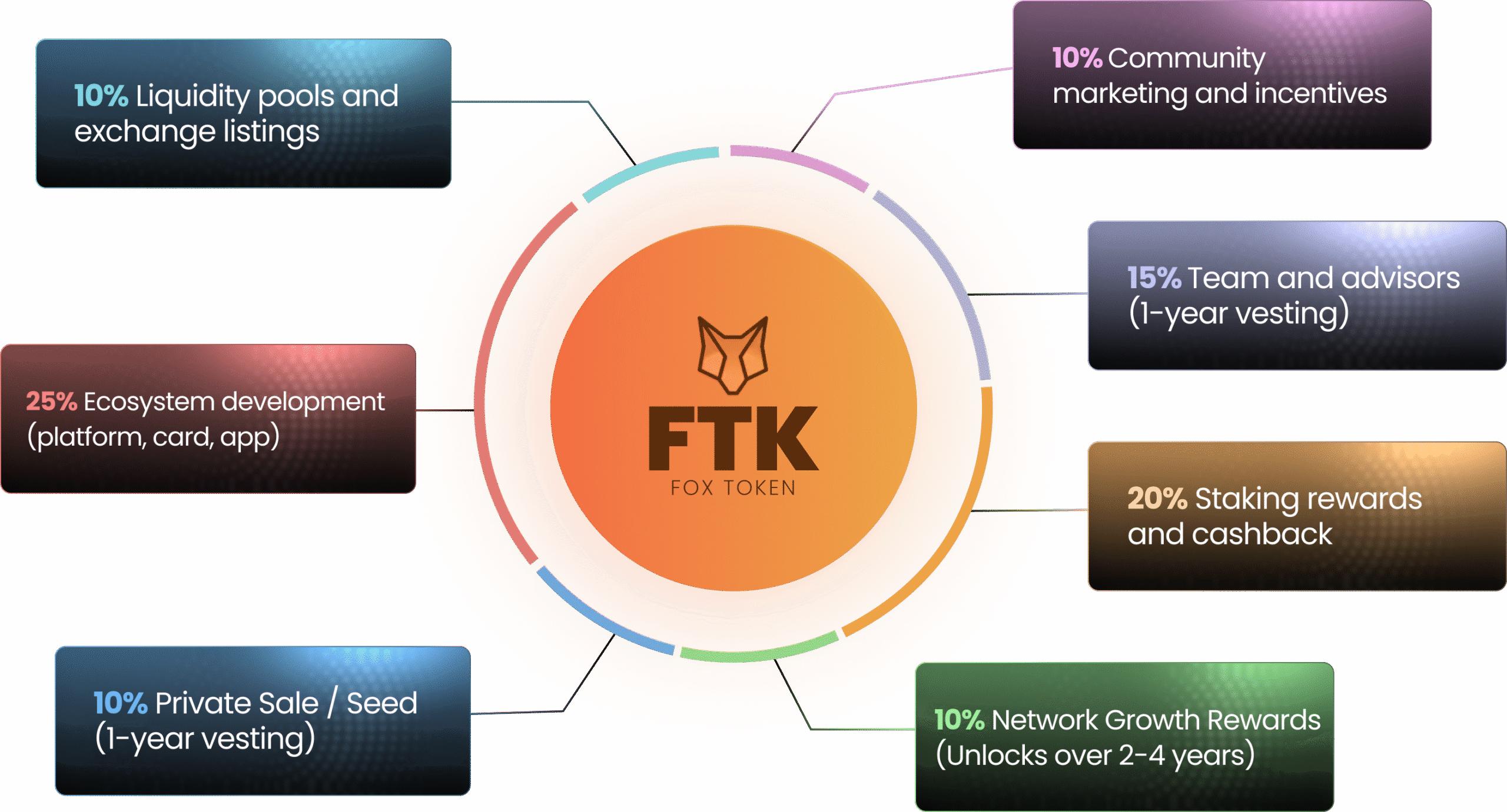 Reserved to reward users staking FOX tokens in DeFi pools and to provide cashback incentives on prepaid card purchases, driving engagement and retention.